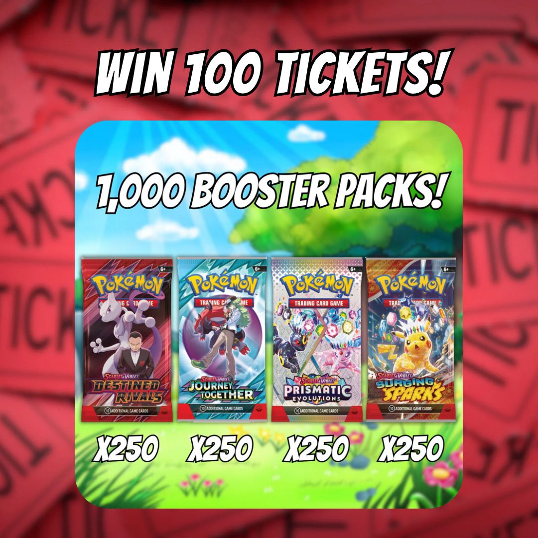 Introducing our latest 100 tickets Competition! We’re giving you the opportunity to win 100 entries for “1,000 Pokémon Booster Packs OR £6,000 Cash” Competition!
