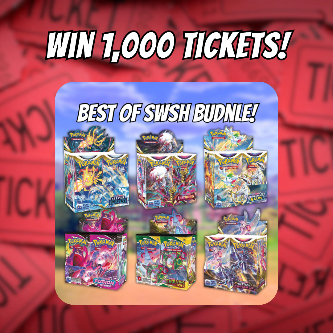 Introducing our latest 1,000 tickets Competition! We’re giving you the opportunity to win 1,000 entries for ‘Best Of SWSH Booster Box Bundle OR £3,250 Cash!’!