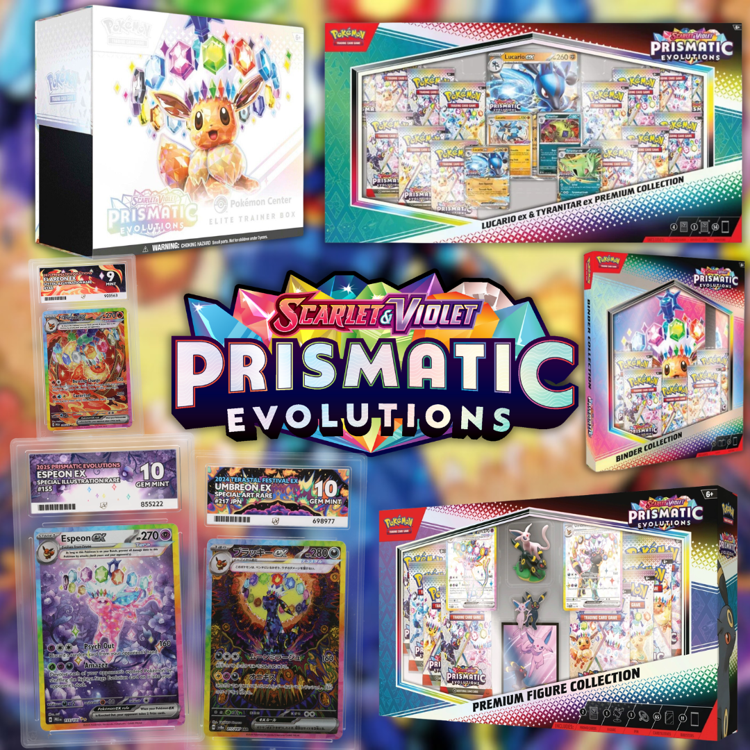 This ultimate bundle includes the following Prismatic Evolutions products: Pokemon Center ETB, Regular ETB, Lucario & Tyranitar Special Box, Premium Figure Box, Booster Bundle, Binder Box, Poster Box, Surprise Box and Tech Sticker Box.